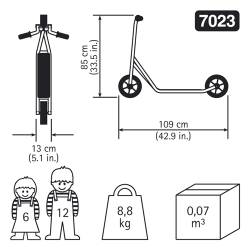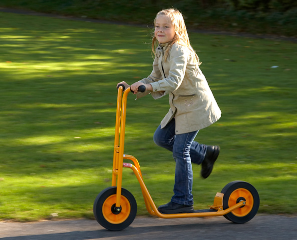 Det høje styr og de store hjul på Maxi løbehjulet gør det muligt for større børn at køre hurtigt og træne balancen gennem fysisk leg. Styret muliggør hurtige retningsskift, og bagbremsen kan stoppe køretøjet omgående.