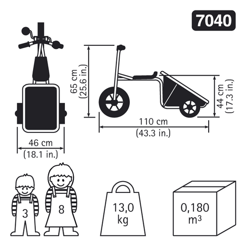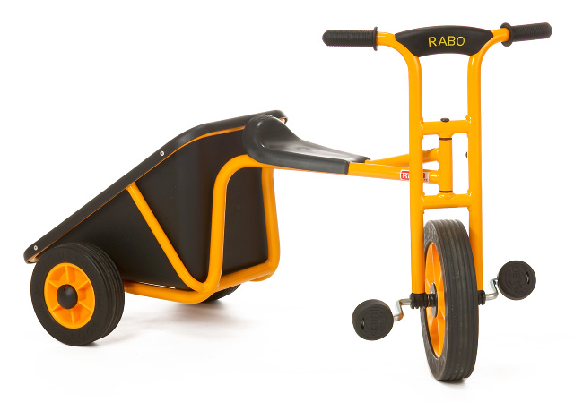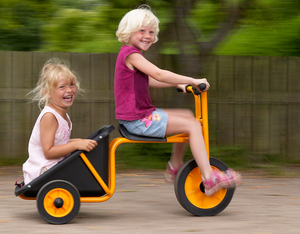 Denne trehjulede cykel er en lastvogn. Den er børnehavens ægte varevogn, da det altid er sjovt at transportere ting og venner rundt på legepladsen.