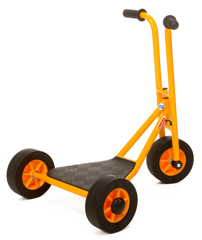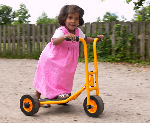 Sparkevognen er en helt unik børnecykel med sine tre brede, stabile hjul og store ståflade, der får selv de mindste til at føle sig sikre, når de står på ét ben og skubber med det andet.